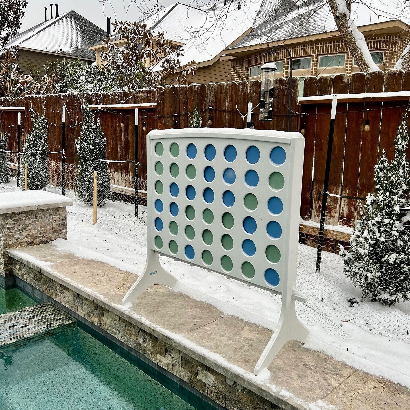 Four in a Row delivers large-scale outdoor entertainment perfect for gatherings with friends and family. It includes a substantial white weather-resistant board and two sets of sizable chips in sage green and sky blue, designed for durability and easy visibility.