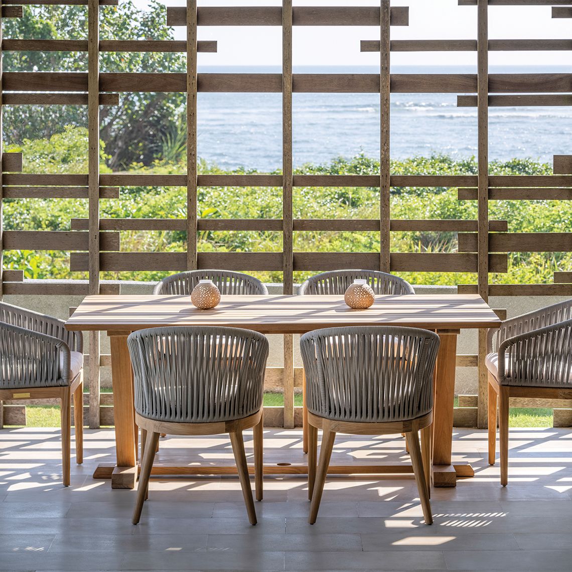 Add a touch of elegance to your outdoor dining experience with the Lucia Dining Armchair. Designed to complement the sleek and modern aesthetic of the Lucia collection, this armchair features a gracefully curved aluminum backrest wrapped in weather-friendly rope. The premium teak base and sling decking provide both style and comfort, making it the perfect addition to any outdoor setting. Elevate your outdoor dining space with the Lucia Dining Armchair.