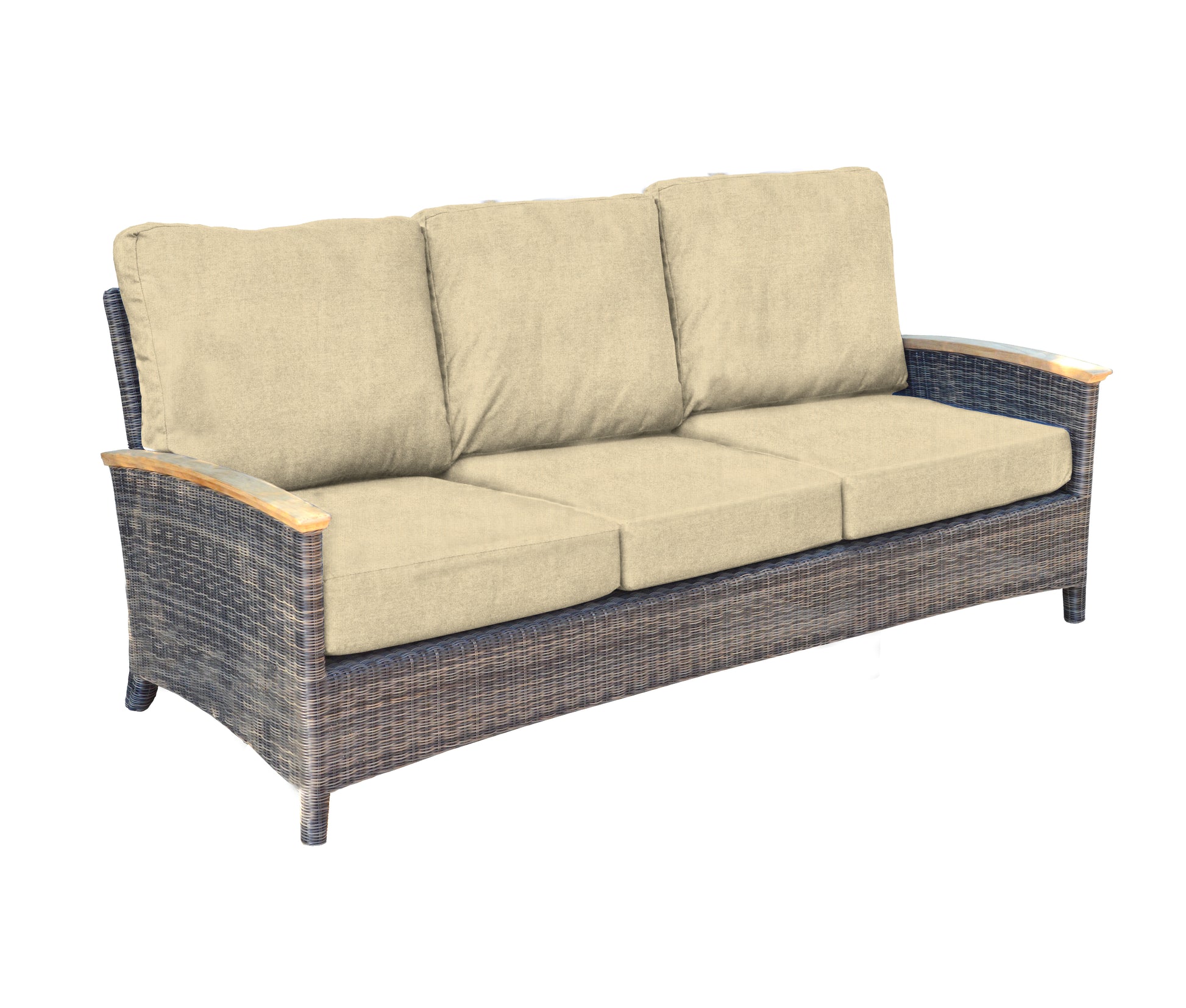 Bella products are made using aluminum frames that are wrapped with handwoven synthetic wicker. Our wicker is UV resistant, colorfast, environmentally friendly, weatherproof, and easy to clean. On Bella products that feature arms, Plantation teak is used as an accent to exude luxury. All Bella cushions are custom-made in-house with foam and Dacron cores covered with Sunbrella® fabric.